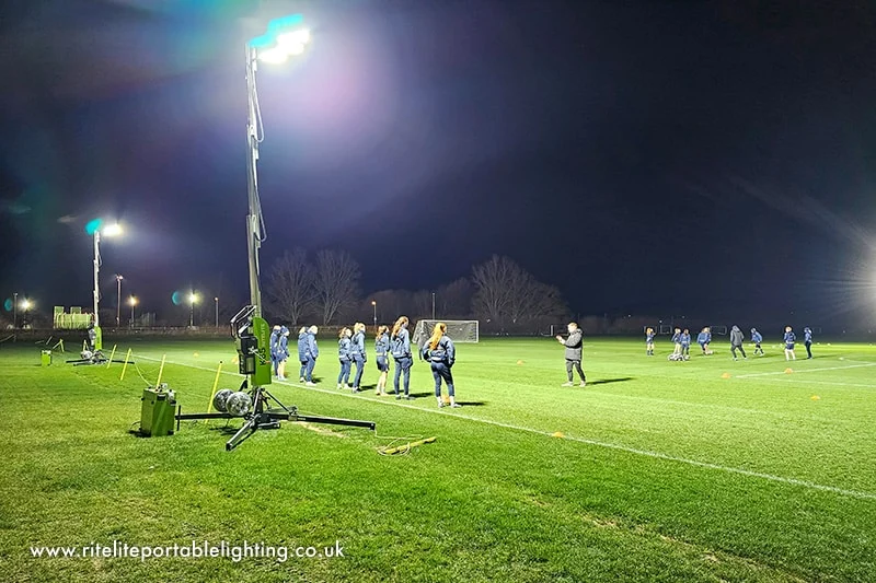 Die LED-Flutlichtanlagen von Ritelite bieten Fußballvereinen, Schulen und kommunalen Organisationen flexible und leistungsstarke Lösungen für die Flutlichtbeleuchtung von Fußballplätzen in den dunklen Monaten. Ganz gleich, ob Sie ein wöchentliches Training für mehrere Altersgruppen durchführen oder versuchen, die kostspielige Anmietung von Flutlichtanlagen zu vermeiden, unsere tragbaren Flutlichtanlagen für den Fußball ermöglichen es Ihnen, mehr Spieler länger auf Ihrem eigenen Platz zu trainieren. Da Spielfelder durch die regelmäßige Nutzung oft abgenutzt oder schlammig werden, geben die Fußballflutlichter von Ritelite den Vereinen die Freiheit, die Trainingseinheiten in andere Bereiche des Platzes zu verlegen. Dies kann dazu beitragen, das Hauptspielfeld zu schützen, die nutzbaren Trainingsbereiche für mehrere Altersgruppen zu erweitern und das Training auf wassergesättigten Flächen zu vermeiden, um die Gesundheit des Spielfelds während der gesamten Saison zu erhalten.