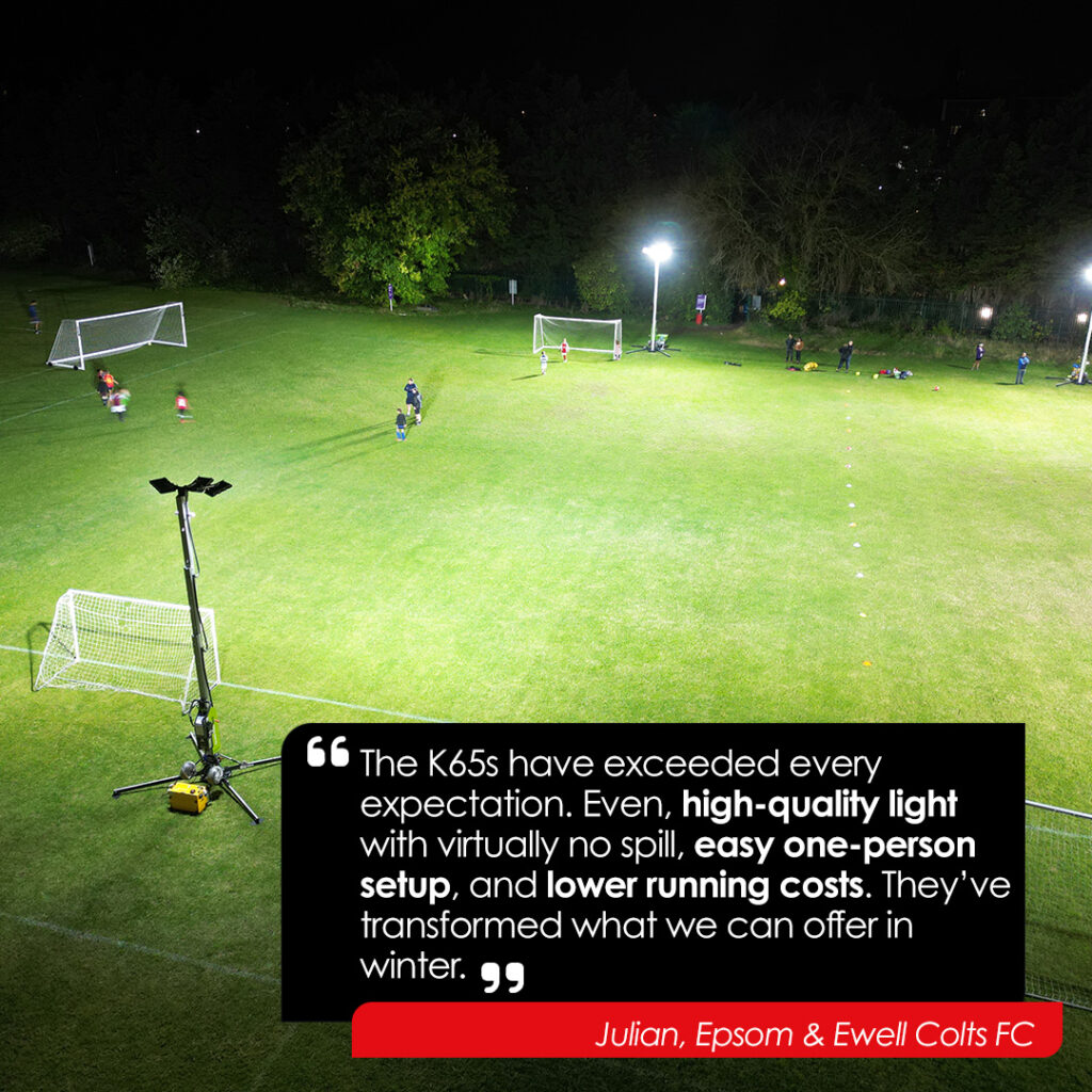 “As a grassroots football club, investing in high-quality lighting is crucial for keeping our teams training throughout the winter months. The Ritelite K65 towers have exceeded every expectation. They provide exceptional, even illumination across the pitch with virtually no light spill, which has been a huge benefit for us and our numerous teams using them at the club.